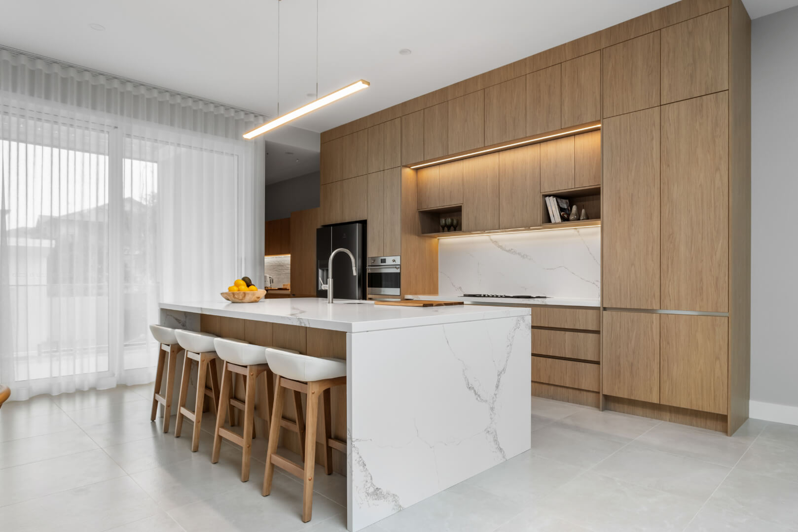 Timber-look finishes are especially popular in modern coastal kitchens, adding warmth while maintaining a contemporary feel. Two-tone cabinetry is also a common choice, combining light and dark finishes to create contrast without overpowering the space.